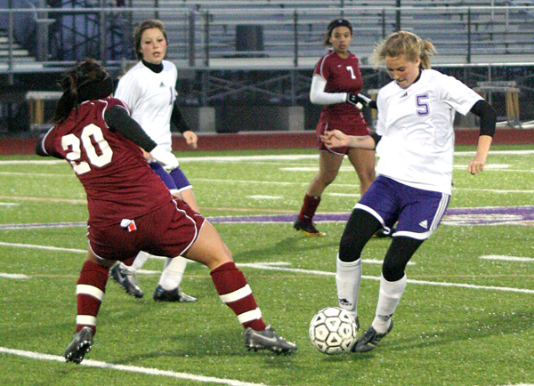 IN PHOTO: Junior center midfielder Alexis Russell (right) scored the Lady Mustangs’ only goal against New Braunfels Canyon. Staff photo by Jennifer Fierro