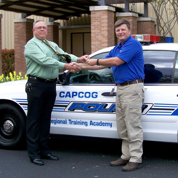 Marble Falls Police Department Assistant Chief Ted Young (left) hands over the keys of a patrol car to Capital Area Council of Governments Training Academy Director Mike Jennings. The car, formerly a patrol car used by Marble Falls police, was donated to the CAPCOG Regional Law Enforcement Training Academy in Austin to teach prospective peace officers advanced driving techniques. Courtesy photo