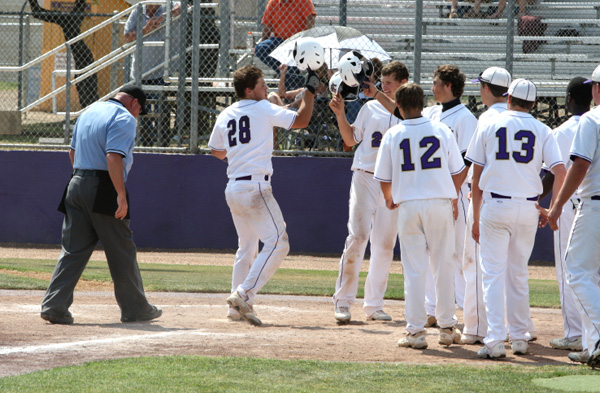 IN PHOTO: Senior Turner McQuaide (left) is congratulated by his teammates after hitting a grand-slam home run against Llano Saturday. Photo by Virgil Belk/Hill Country Sports Images