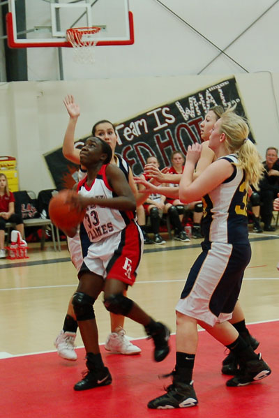 Faith Academy freshman guard Juliette Fisher drives to the basket for a score in the win against Temple Holy Trinity on Feb. 8. Photo by Dee Anna Piatek