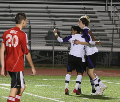 Marble Falls junior forward Carter Robertson (right) is greeted by teammates after scoring the game-winning goal against Lake Travis on March 8. Photo by Virgil Belk/Hill Country Sports Images