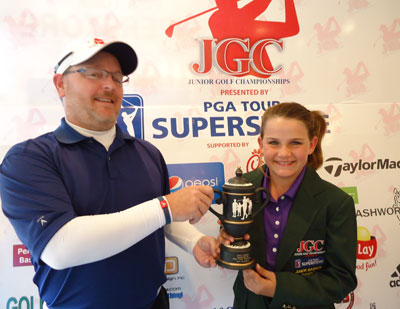 David Fore, events manager of the PBA Superstore for Atlanta, presents Macy Fox with the Junior Golf Championships Junior Masters trophy and green jacket. Courtesy photo