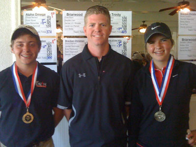 Faith Academy golfers Peter Perkins (left) and Beth Ann Berkman, standing with Faith Academy athletic director John Berkman, display their regional medals at the regional gld tournament at Meadowlakes April 4. Both will play in the state golf tournament in Killeen April 18-19. Courtesy photo