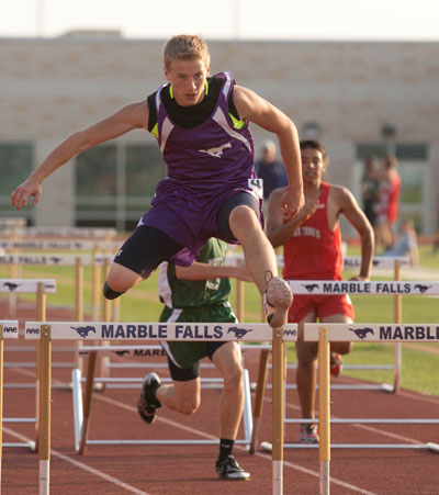 Marble Falls eighth-grade hurdler Hunter Moreno wins the 110-meter hurdles during the district meet April 6-7. Photo by Diana Cox