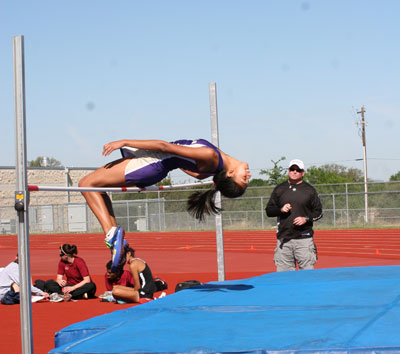 Marble Falls junior Priscilla Martinez jumps 5 feet 2 inches to finish second in the District 25-4A meet April 12. Staff photo by Jennifer Fierro