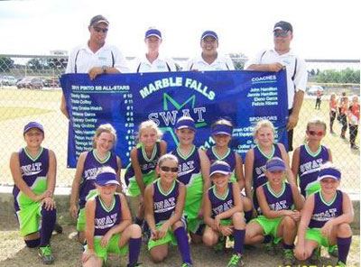 The SWAT softball team will play at a national tournament thanks to finishing in the top four at a regional tournament in Medina Valley on July 8-10. The 8-and-under squad includes Sydney Gentry (front row, left), T.J. Blum, Tapenga Macias, Bailey Hamilton and Payton Hodge; Adriana Garza (second row, left), Lexy Drake-Welach, Kurstin Williams, Emily Norton, Keenly Wendt, Trista Coffey and Lindy Grubbs; manager John Hamilton (standing, left) and assistant coaches Jennie Hamilton, Felicia Ribera and Leno Garza. Courtesy photo