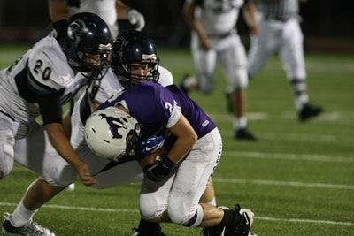 Mustang senior receiver Clynt Powell lowers his shoulder after making a catch. The champion was Boerne in five overtimes with a score of 35-29. Photo by Virgil Belk/Hill Country Sports Images