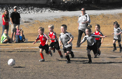 Llano Youth Soccer Association players chase down a ball at the opening-season games Oct. 1 at Dauber Dome in Llano. The next games are Oct. 8. Courtesy photo