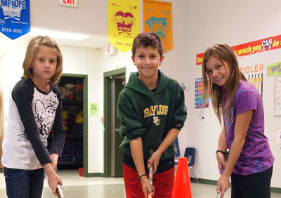 PHOTO: Spicewood Elementary School Hockey Club captains Tenley Holley (left), Hunter McDonough and Heather Hahn are three of the almost 40 students who participate in the weekly after-school program. Staff photo by Daniel Clifton