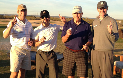 PHOTO 1: Michael Hillman (left) and Kenneth Hillman celebrate their father Gary Hillman’s first hole-in-one with Horseshoe Bay Summit Rock Head Professional Brandon Dixon. Courtesy photo