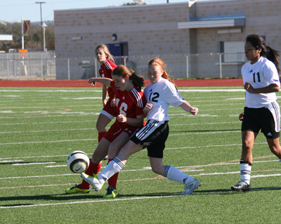 PHOTO 1: Marble Falls High School freshman defender Shelby Wyatt (center) attempts a pass against Fredericksburg as junior Cristina Sanchez trails the play at the Winter Classic. Staff photo by Jennifer Fierro