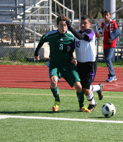 PHOTO: Marble Falls High School junior fullback Edgar Aguilar (right) fights for the ball during the loss to Killeen Ellison on Jan. 13 at the Winter Classic in Marble Falls. Staff photo by Jennifer Fierro