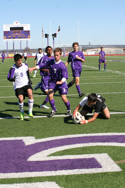 PHOTO 1: Marble Falls High School sophomore Devin Tharp (left) is a couple of steps too late for a shot at the goal against Austin LBJ. Staff photo by Jennifer Fierro