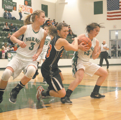 PHOTO: Shelby Wilson (right), a Burnet High School freshman guard, takes the ball away from Llano High School sophomore forward Ericka Tisdale as senior Leah Cotton prepares to run to the opposite side of the court. The Lady Dawgs won 62-29. Staff photo by Jennifer Fierro