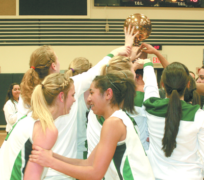 Burnet High School guards Leah Cotton (left) and freshman point guard Riley Scott celebrate the Lady Dawgs’ area round playoff win against Yoakum Feb. 17 as their teammates gather around the gold trophy. For more on this game and other sports and recreation news, turn to page 17. Staff photo by Jennifer Fierro