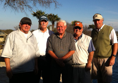 Chuck Lathrop (center) of Horseshoe Bay aced the 178-yard par 3 third hole Feb. 20 at the Apple Rock Golf Course using a 5-wood to record his seventh hole-in-one. Witnesses were Larry Manning (left), John Bailey, Lathrop, Tom Hilton and Don Hoff. Courtesy photo