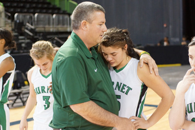 PHOTO 1: Burnet High School girls basketball coach Mike Cavender comforts senior forward Hillary Foster after the Lady Dawgs lost to Liberty Hill 58-36 in the Class 3A Region IV final Feb. 25. The Lady Panthers have beaten the Lady Dawgs in five straight meetings. Photo by B.J. Rosow