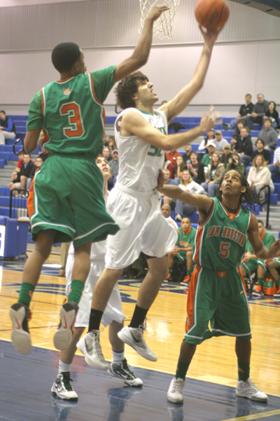 Burnet High School post Jacob Pollard scores two of his 11 points on a lay-up in the loss to San Antonio Sam Houston 92-53 in the area round of the Class 3A playoffs Feb. 24 at Kyle Lehman High School. The Bulldogs finished the season 15-14. Senior guard Grant Cole led the Bulldogs with 19 points.