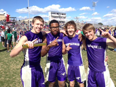 PHOTO 1: The Marble Falls High School junior varsity boys 800-meter relay team of Steven Petrosky (left), Keith Jerome, Austin Bird and J.T. Watson finished first at the 49th annual Carlin Wicker Relays in Fredericksburg March 3. Courtesy photos