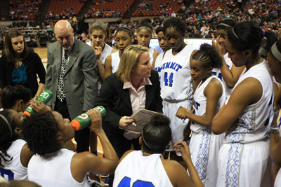 PHOTO 1: Mansfield Summit girls basketball head coach Tammy Lusinger (center) refocused the Lady Jaguars during a timeout while playing in the Class 4A state tournament last weekend. Courtesy photo