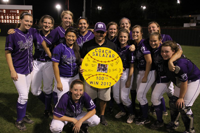 Marble Falls High School softball coach Tino Salazar (center) celebrates his 100th victory as a head coach in a public school with his Lady Mustangs March 27. Marble Falls defeated Lake Travis 6-4 moments earlier to finish the first round of the District 25-4A race tied with the Lady Cavs for first place at 5-1. Courtesy photo