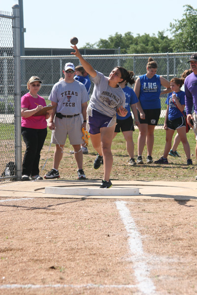 PHOTO 1: Marble Falls High School sophomore Teagan Hall finishes second in the varsity girls shot put competition with a heave of 33 feet 2.5 inches at the Daybreak Rotary Mustang Relays. Staff photos by Jennifer Fierro