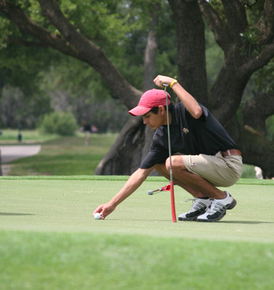 PHOTO 1: Marble Falls High School’s Joe Portillo shot an 80 — the Mustangs’ lowest first-round score — during the District 25-4A Tournament April 9 at Delaware Springs Municipal Golf Course in Burnet. Staff photo by Jennifer Fierro