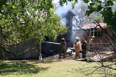 PHOTO 1: Firefighters from area agencies assisted the Kingsland Volunteer Fire Department with a two-story shed fire that scorched a nearby home and resulted in the evacuation of neighbors just before noon April 23 in the 1800 block of McArthur Avenue. Staff photo by Connie Swinney