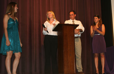 PHOTO 1: Marble Falls High School senior Katherine Dillard (left) was given a special thank-you for her contributions to the girls soccer program from head coach Paulette Moczygemba and assistant coaches Tom Lane and Krista Harris during the awards ceremony May 1 at the high school. Staff photo by Jennifer Fierro