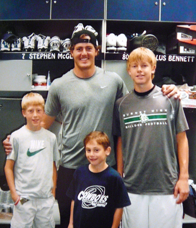 PHOTO: Dallas Cowboys quarterback Stephen McGee (middle) gives brothers Drew (left), Luke and Derek Kiser a tour of the locker room at Valley Ranch, the Cowboys’ training facility, in 2010. For the 2012 season, Derek Kiser will be Burnet High School’s starting quarterback, a role McGee filled a decade earlier. Courtesy photo