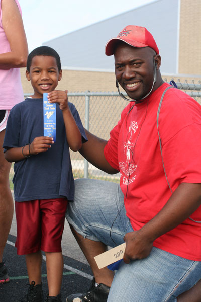 PHOTO 1: Jonathan Frazier, 7, accepts the first-place ribbon for the 100-meter dash from Arthur Eaglin at the Wings of Eagles track meet June 2 at Pony Stadium in Marble Falls. Staff photos by Jennifer Fierro