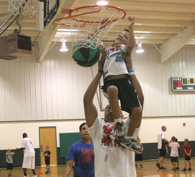 PHOTO 1: Kaden Edwards, 4, dunks the ball thanks to a lift from Bulldogs Basketball Camp counselor Demone Belmarez during camp. Staff photos by Jennifer Fierro