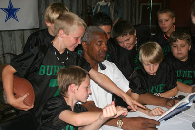 Former Dallas Cowboys cornerback Everson Walls (center) shows members of the Burnet Youth Football League his book, “A Gift To Ron,” that details his decision to give a kidney to former teammate Ron Springs. Players include Cash Gililland (sitting), Walls, Triston Shirley and Conner Kolb; Tyler Davis (standing), Jacob Hein, Ivan Interial, Joe Lopez and Kolebie Stevens. Walls was in Burnet to sign autographs for a fundraiser for the organization June 16. Staff photo