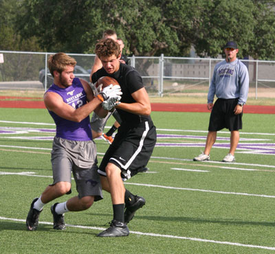 PHOTO 1: Llano High School’s Isaac Hutto (right) hauls in a pass for a first down during 7-on-7 play against Marble Falls as Mustang Brian Shrubar defends June 19. Staff photo by Jennifer Fierro