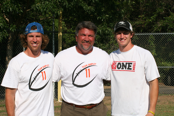 PHOTO: Team Shipley was in full force June 22 at the West Austin Youth Association to help former Burnet High School standout and Cincinnati Bengal Jordan Shipley (left) with his football camp. Also on staff was his dad, Bob, (center) the former head coach of the Bulldogs and current athletic director and head football coach at Brownwood High School, and little brother Jaxon, who is gearing up for his second year as a Longhorn receiver. Staff photo by Jennifer Fierro