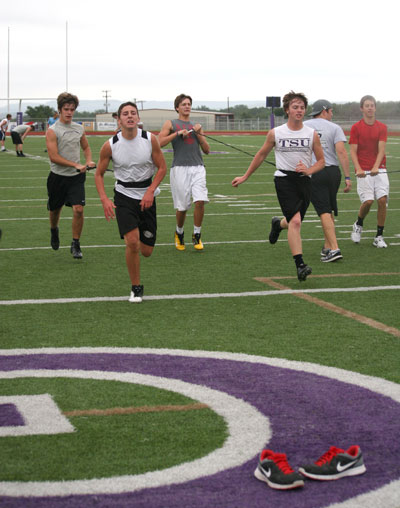 PHOTO 1: Marble Falls High School athletes Cody Skipper (front, left) and Jacob Wyatt run as hard as they can, while partners Tyler Lindholm (back, left) and Maverick Hendrix offer resistance by holding cords that are designed to slow them down during workouts with Performance Course on June 13. Staff photo by Jennifer Fierro