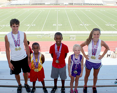 PHOTO 1: Marble Falls Independent School District students Cody Schulz (left), Ashton Torns, Anthony Torns, Tatum Hopkins and Natalie Schultz qualified for the state meet of Texas Amateur Athletic Federation on July 27-29 in Corpus Christi. Cody Schultz, a senior at Marble Falls High School, won the 100 meters and 200 meters, while his sister, Natalie, a freshman, won the 200 meters and finished second in the 400 meters in the girls division. Hopkins earned three silver medals in the 50 meters, 100 meters and 200 meters. All are members of Wings of Eagles Track Club coached by Anthony Torns. Courtesy photos