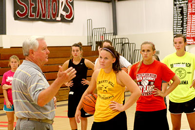 Faith Academy of Marble Falls girls basketball coach Jerry English talks to players who attended his final summer camp of 2012. Some of the players included Sara Burrage of Faith Academy (left), Erica Tisdale and Claire Williams, both of Llano, and Chandler Dean of Guyer High School; Taylor Denton (center) and Sierra Brinkley, both of Faith Academy. Staff photo by Jennifer Fierro