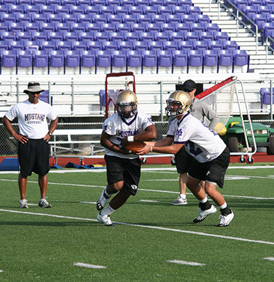 PHOTO 1: Marble Falls High School quarterback Mike Richardson hands off the ball to Keith Jerome during the first day of the Mustangs football training camp Aug. 13. Staff photos by Jennifer Fierro
