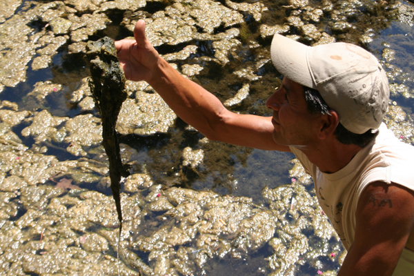 PHOTO 1: Maintenance crew worker Gabriel Rodriguez scoops up a handful of algae, collecting in a cove on Bay Point Drive in Horseshoe Bay. Lower Colorado River Authority officials say the only way to combat the aquatic plant is to haul it out or apply copper-based herbacides. Staff photos by Connie Swinney