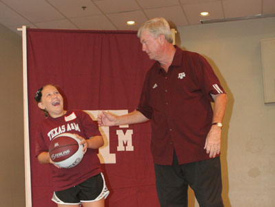 PHOTO: Kenadee Stewart laughs at Texas A&M University women’s basketball coach Gary Blair after he jokes with her telling her not to mess up a demonstration and let people think she was taught the drill from a Longhorn. Blair was the featured speaker during the Highland Lakes Aggies Club coach’s night at Lakeside Pavilion in Marble Falls on Aug. 30. Stewart attended Blair’s camp during the summer. Staff photo by Jennifer Fierro