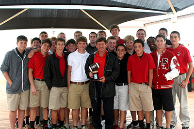 The Faith Academy of Marble Falls football team presented head coach Russ Roberts (middle front) with a trophy Sept. 14 commemorating his 200th career win and the Flames’ first victory as an 11-man football program, a 16-8 victory at St. Anthony’s Catholic School of San Antonio on Sept. 8. The players are Josh Griffin (front row, left), Asa Ortiz, Brian Freeman, Jake Fereday, Roberts, Gavin Henderson, Josh Debo and Jake Diamond; Rich Coleman (second row, left), Luke Hering, Clay Cozby, Hunter Manchac, Mitch Earwood, Cole Madigan, Royale Brown and Jarrett Haydon; Tristan Wilson (back row, left), Michael Masterson, Seth McAnally, Brendan Cockroft, Matthew Manley, Jason Byrd and Zach Haydon. The Flames (2-0) travel to Saint Mary’s Hall, 9401 Starcrest Drive in San Antonio, Sept. 21 for a 7:30 p.m. kickoff. Staff photo by Jennifer Fierro