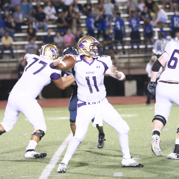PHOTO: Marble Falls quarterback Mike Richardson attempts a pass in the second quarter of the Mustangs’ game against Boerne Champion. The senior threw for a state record 724 yards in a 62-55 victory Sept. 20, passing the previous mark of 683 yards set last year by Dylan Sheffield of Wichita Falls. Photo courtesy Diana Cox