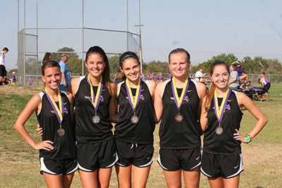 PHOTO 1: The Marble Falls High School varsity girls cross-country team includes Darby Hibbs (left), Sarah Stripling, Katelyn Corley, Haley Stephens and Tess Johnson. Staff photos by Jennifer Fierro
