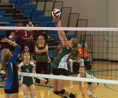 PHOTO 1: Burnet High School freshman middle blocker Jill Rosow tips the ball over the Lampasas blockers as junior setter Danielle Lindley watches. Photos by B.J. Rosow