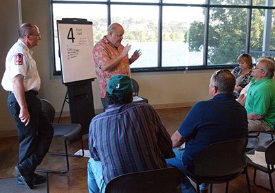 PHOTO: Marble Falls Mayor George Russell (center) leads a small-group discussion Sept. 25 at Lakeside Pavilion as residents debate proposed city ordinance amendments for front yards. Marble Falls Fire Rescue Interim Chief Johnny Caraway takes notes during the exchange that will be passed on later to City Council members. Staff photo by Daniel Clifton
