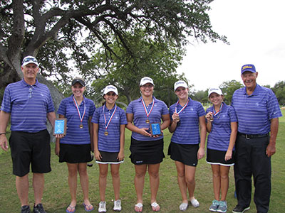 PHOTO 1: The Marble Falls High School girls golf team includes head coach Lonnie Tackitt (left), Samantha Offutt, Chloe Parnell, Tori Gomez, Blair Hambrick, Brianna Heinzke and assistant coach Wayne Neely. Courtesy photos