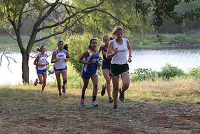 PHOTO: Burnet High School senior Kathryn Drake (front) keeps up a good pace during the Burnet High School Cross Country Relays on Aug. 25 at Reveille Peak Ranch in Burnet. Among being the top female runner for the Lady Dawgs, Drake also is ranked in the top five in her class, serves as student body president, volunteers and plays the violin. Staff photo by Jennifer Fierro