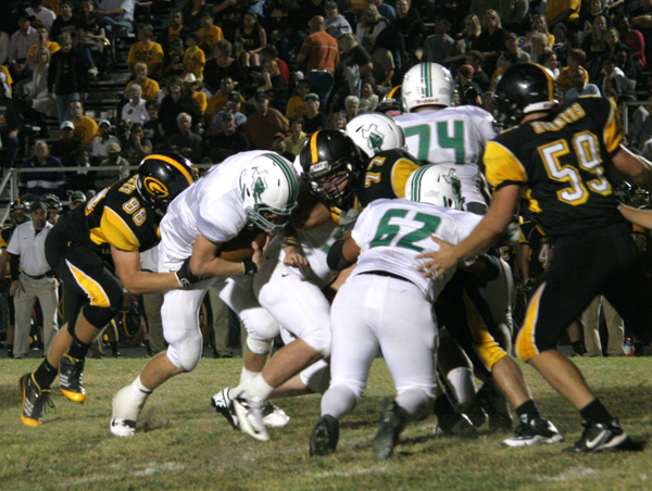 PHOTO: Burnet High School junior quarterback Derek Kiser (second from left) lowers his head and pushes forward for a first down against Gatesville on Oct. 19. Staff photo by Jennifer Fierro