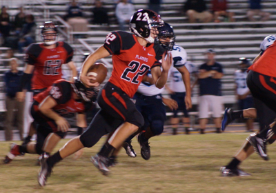 PHOTO: Faith Academy of Marble Falls senior running back Jake Diamond carries the ball behind a blocker in the Flames’ game against the Texas School for the Deaf at Pony Stadium in Marble Falls on Oct. 19. Photo by Paloma Ortiz